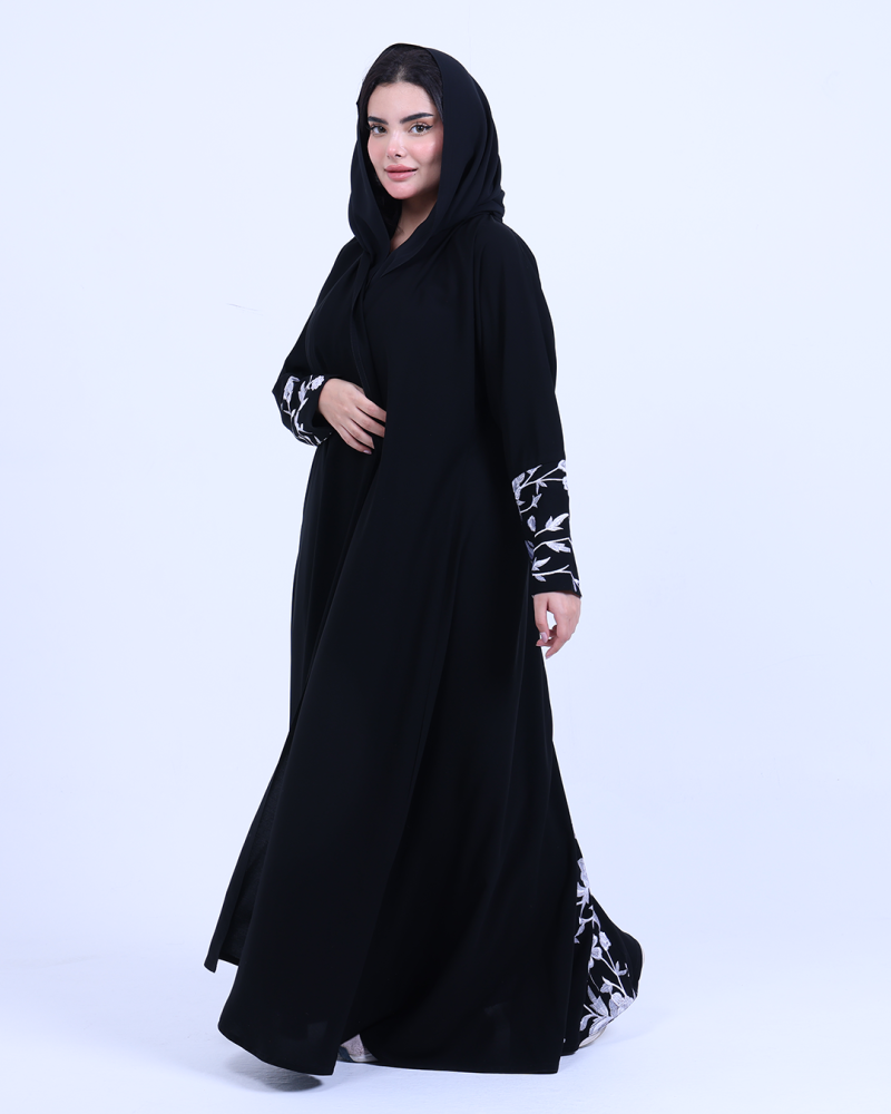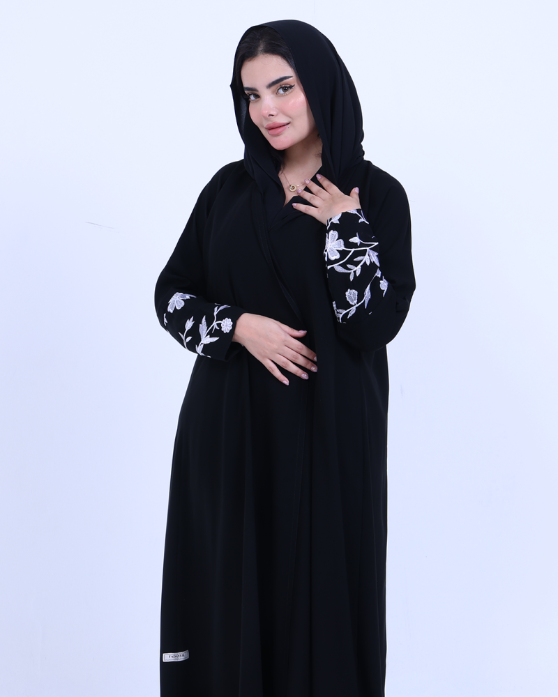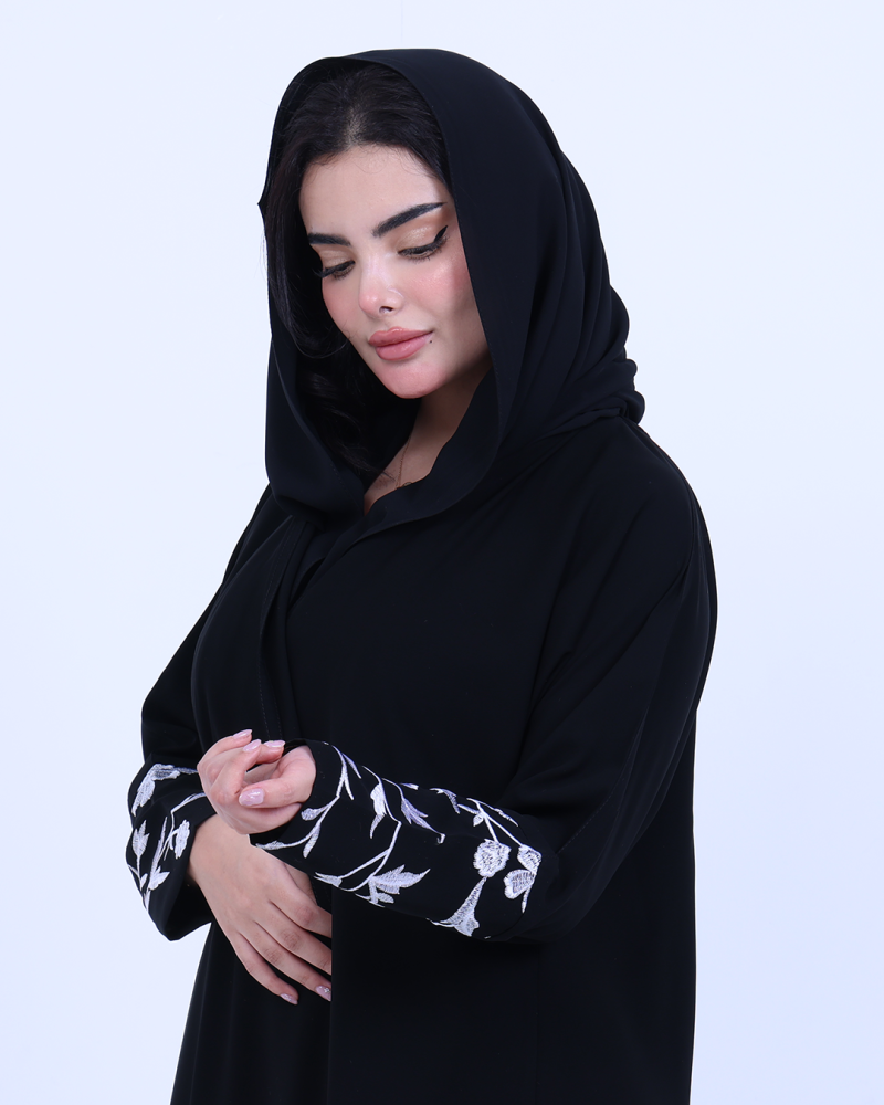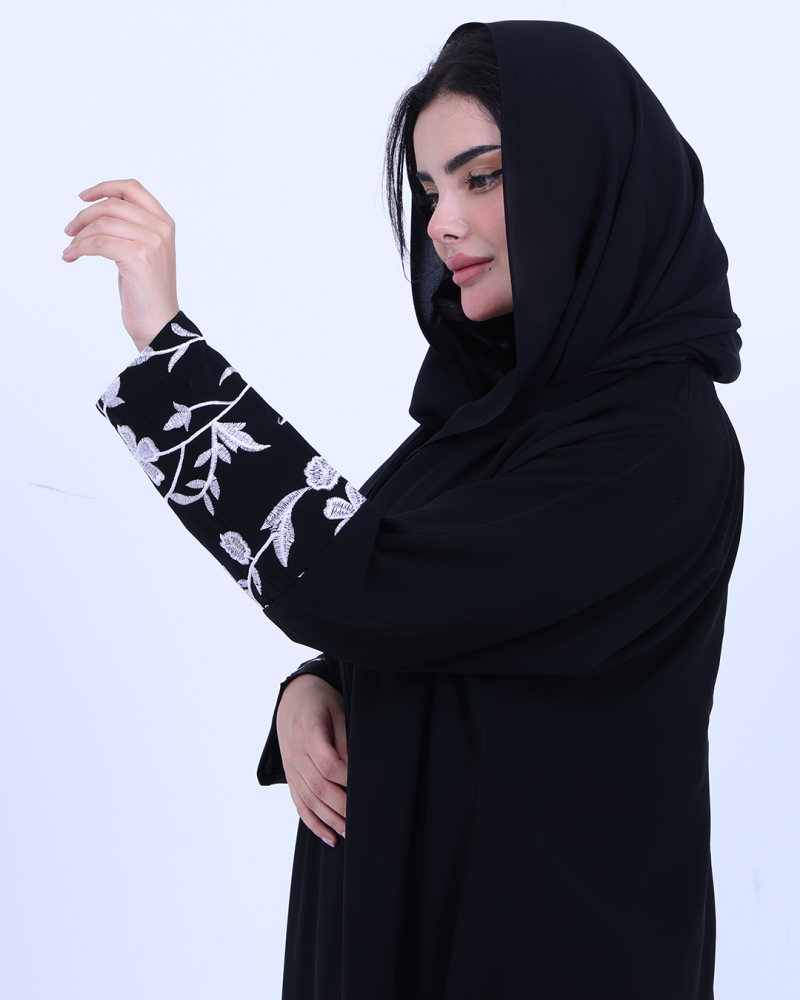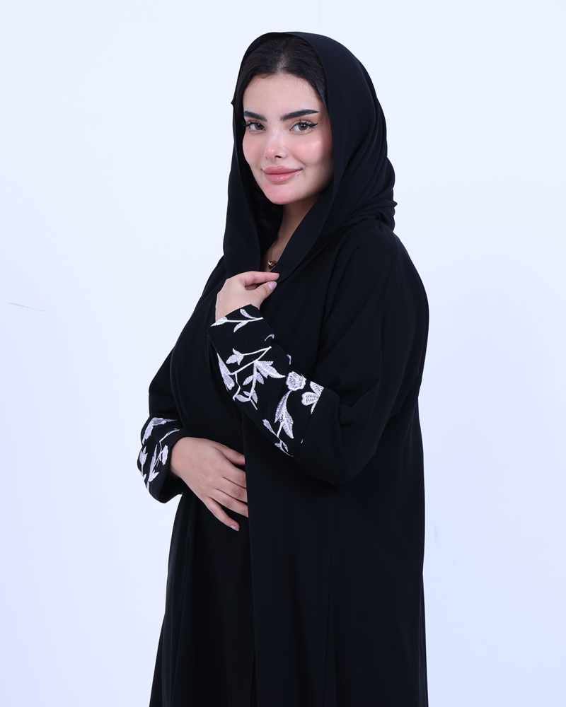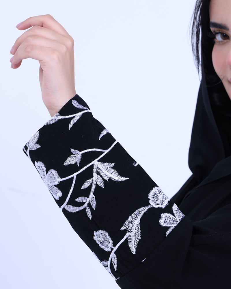 عباية راقية بتفاصيل ناعمة مصنوعة من كريب أسود ناعم ينسدل بأناقة دون شفافية أو التصاق. تطريز أبيض أنيق يزيّن الأكمام والظهر بأسلوب راقٍ وبارز، يمنحك إطلالة أنثوية متقنة. القصة نصف كلوش تضيف انسيابية ناعمة، بينما تضفي الأكمام الضيّقة مظهرًا عصريًا يحتضن الذوق الكلاسيكي بأناقة متجددة. تأتي العباية بطرحة سادة متناسقة لتكمل الإطلالة بكل بساطة وأناقة.