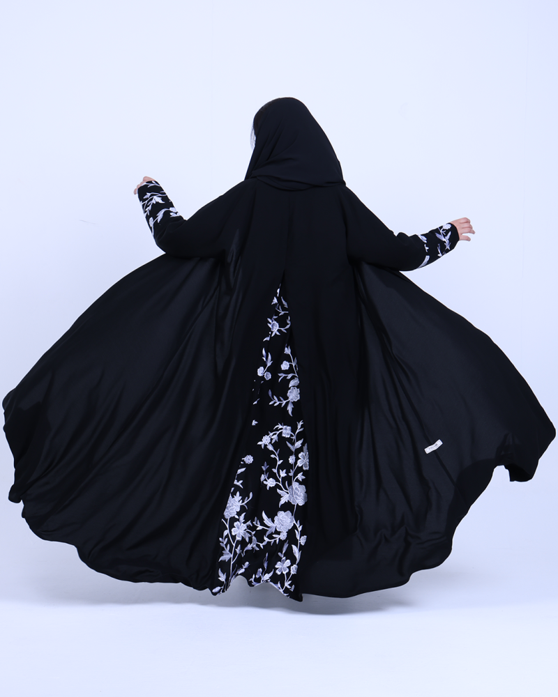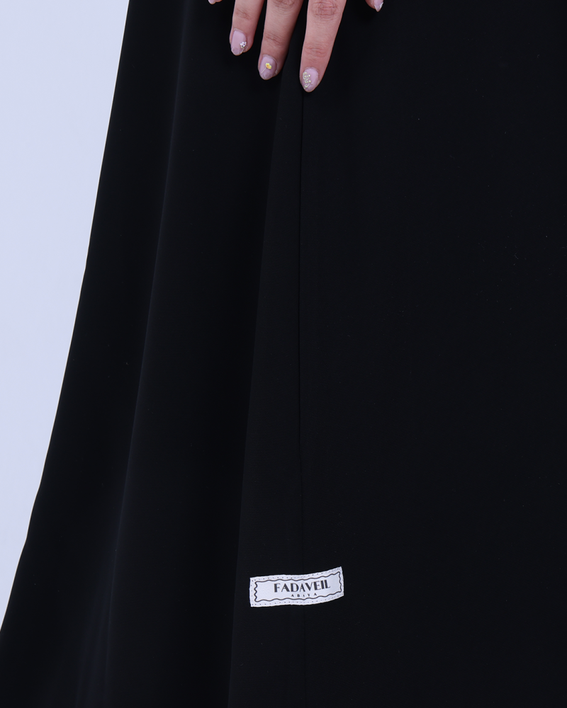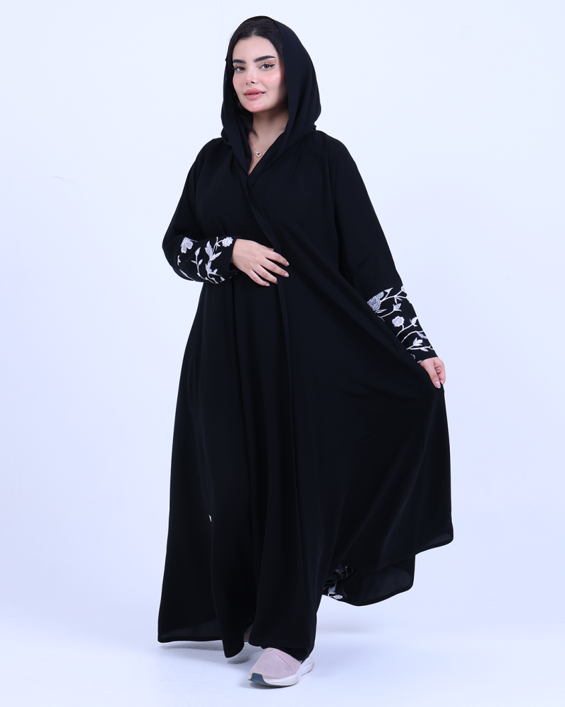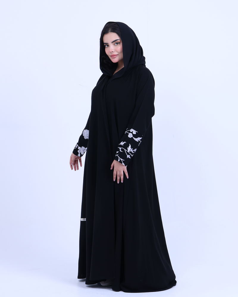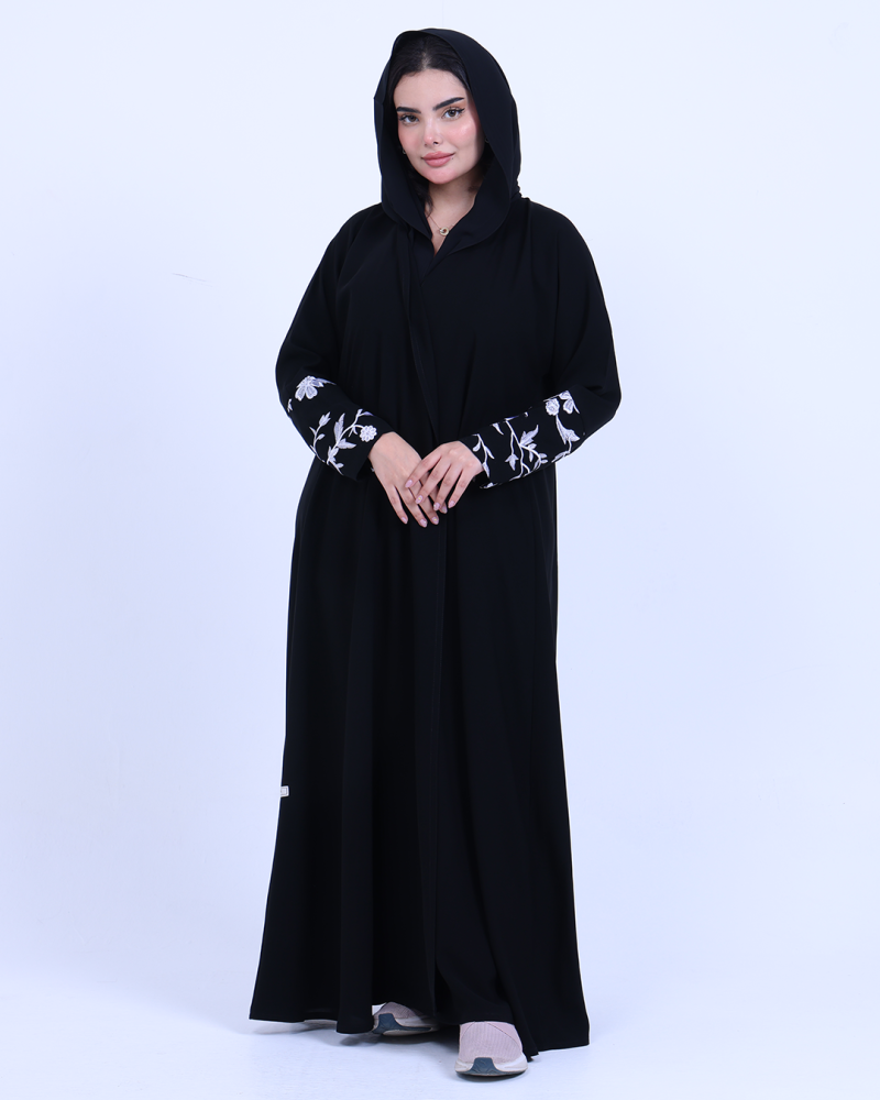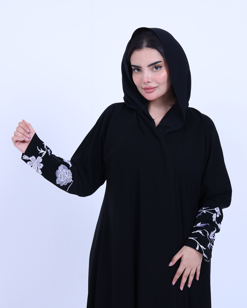 عباية راقية بتفاصيل ناعمة مصنوعة من كريب أسود ناعم ينسدل بأناقة دون شفافية أو التصاق. تطريز أبيض أنيق يزيّن الأكمام والظهر بأسلوب راقٍ وبارز، يمنحك إطلالة أنثوية متقنة. القصة نصف كلوش تضيف انسيابية ناعمة، بينما تضفي الأكمام الضيّقة مظهرًا عصريًا يحتضن الذوق الكلاسيكي بأناقة متجددة. تأتي العباية بطرحة سادة متناسقة لتكمل الإطلالة بكل بساطة وأناقة.