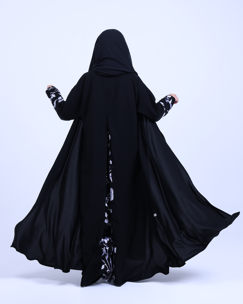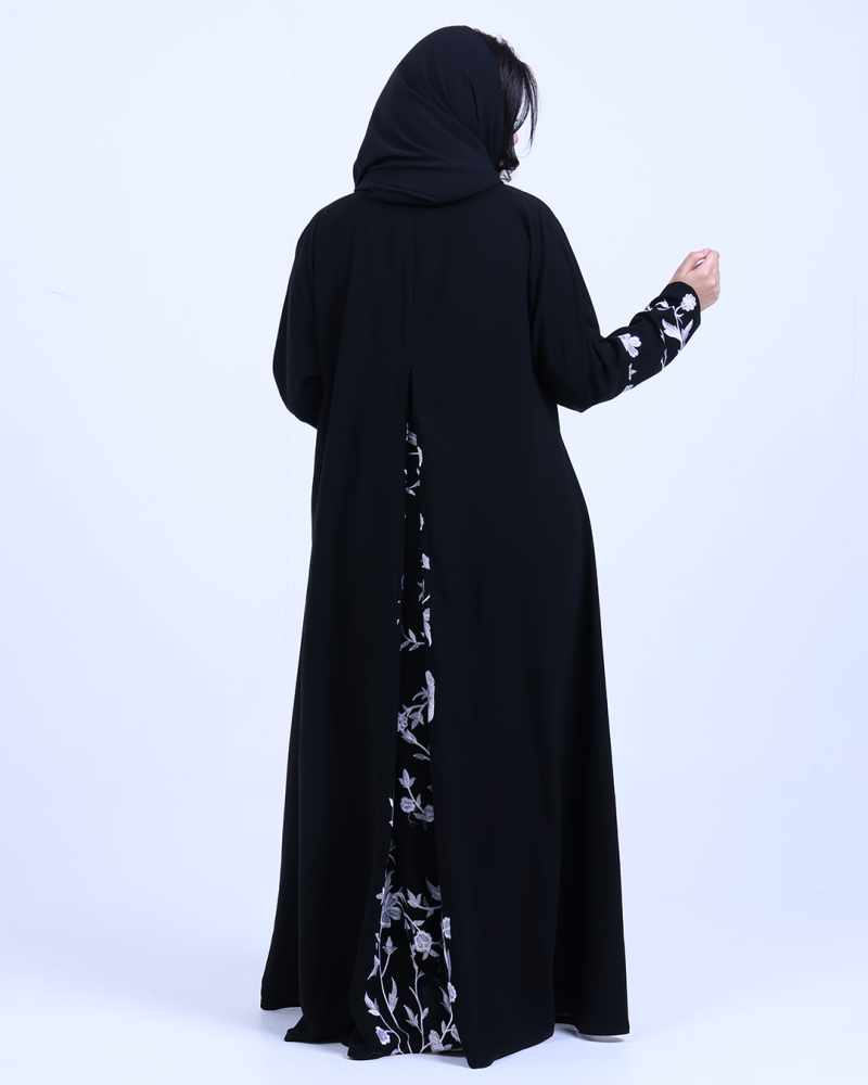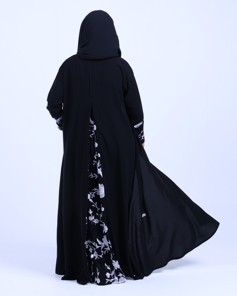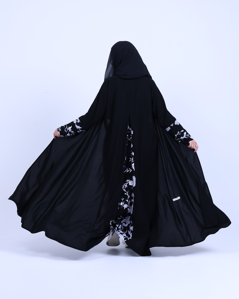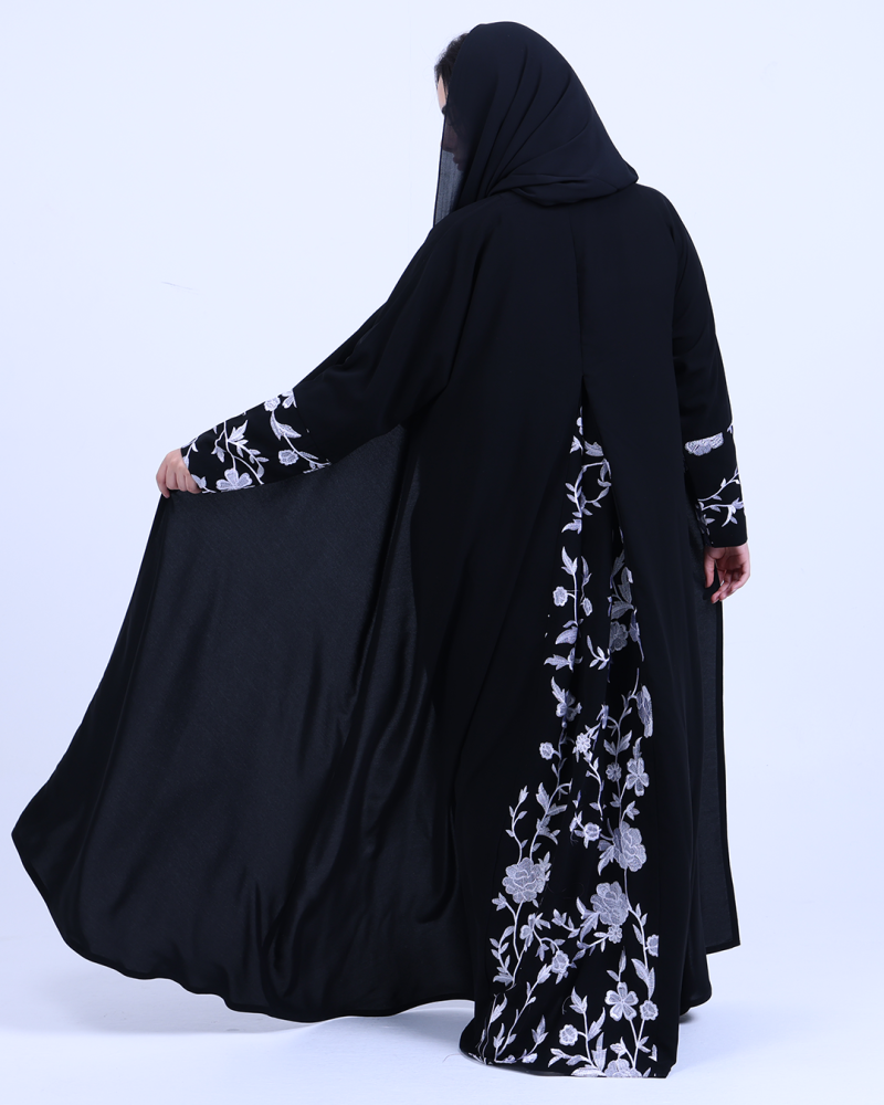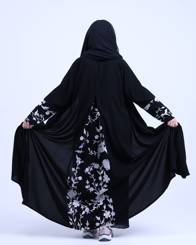عباية راقية بتفاصيل ناعمة مصنوعة من كريب أسود ناعم ينسدل بأناقة دون شفافية أو التصاق. تطريز أبيض أنيق يزيّن الأكمام والظهر بأسلوب راقٍ وبارز، يمنحك إطلالة أنثوية متقنة. القصة نصف كلوش تضيف انسيابية ناعمة، بينما تضفي الأكمام الضيّقة مظهرًا عصريًا يحتضن الذوق الكلاسيكي بأناقة متجددة. تأتي العباية بطرحة سادة متناسقة لتكمل الإطلالة بكل بساطة وأناقة.