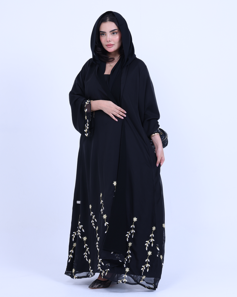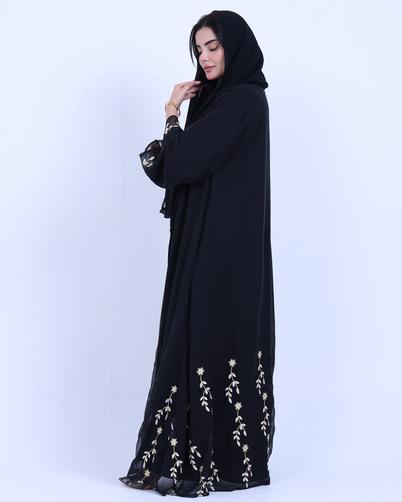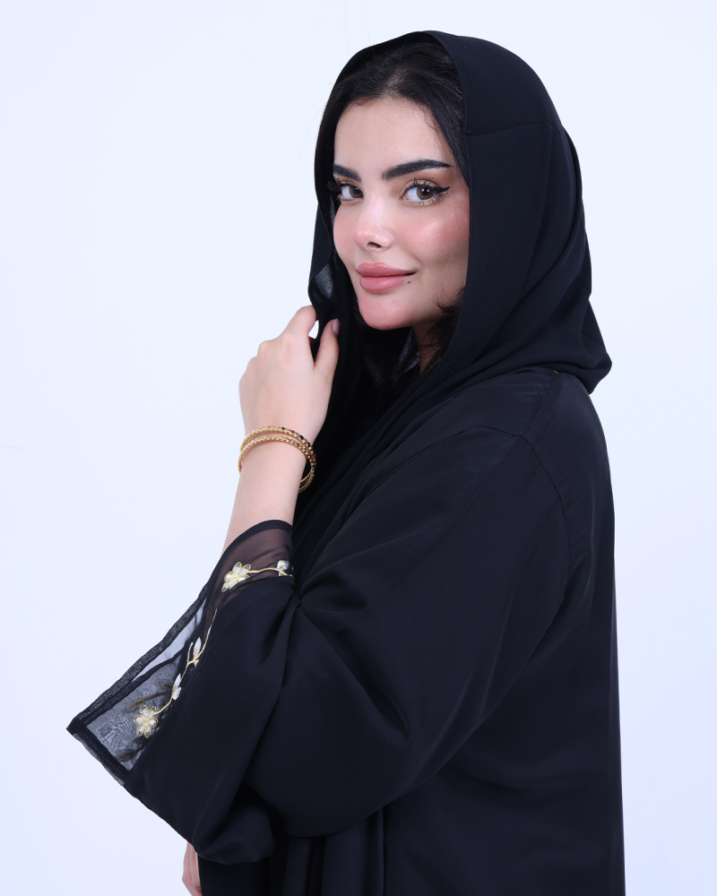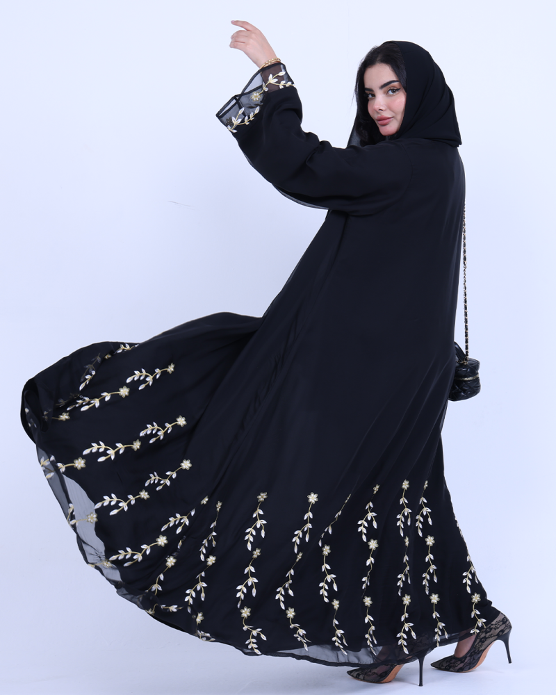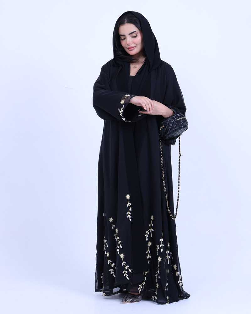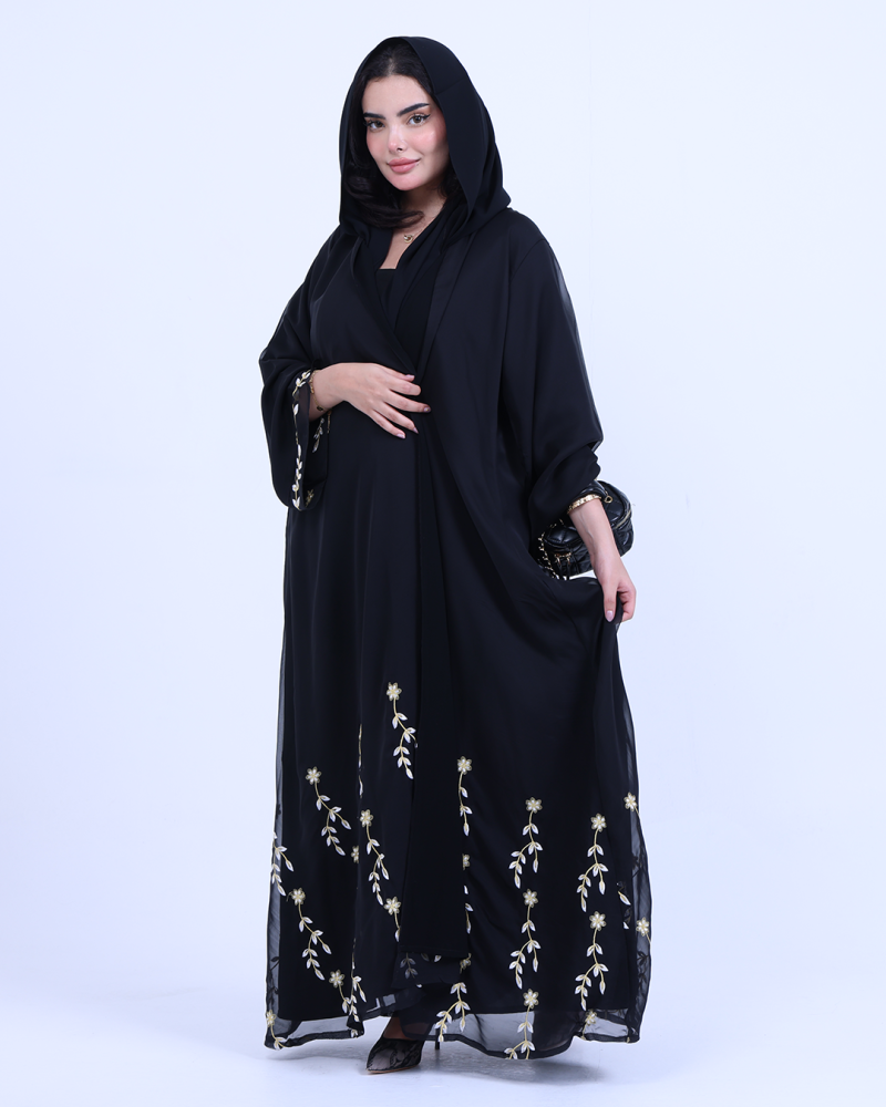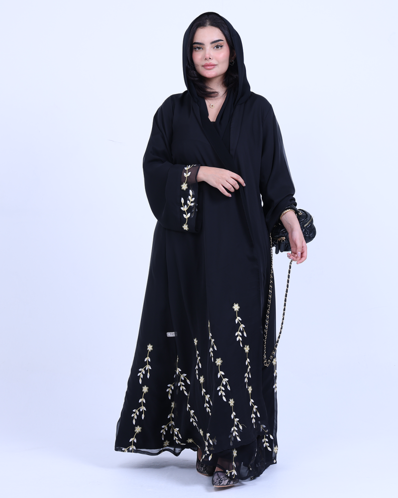 عباية ملكية التصميم تنطق فخامة، مصنوعة من طبقتين: شيفون ناعم مطرّز بخيوط ذهبية فاخرة تنسدل برقي على الأطراف، مع بطانة من كريب كوري أنيق يمنحك تغطية مثالية وراحة في اللبس. تطريز الأزهار الذهبية يزين أسفل العباية وأطراف الأكمام ليمنحك حضورًا أنثويًا ساحرًا في كل حركة. قصة نصف كلوش تضيف انسيابية راقية دون مبالغة، وتأتي العباية بطرحة سادة لتكمل الأناقة ببساطة ناعمة.