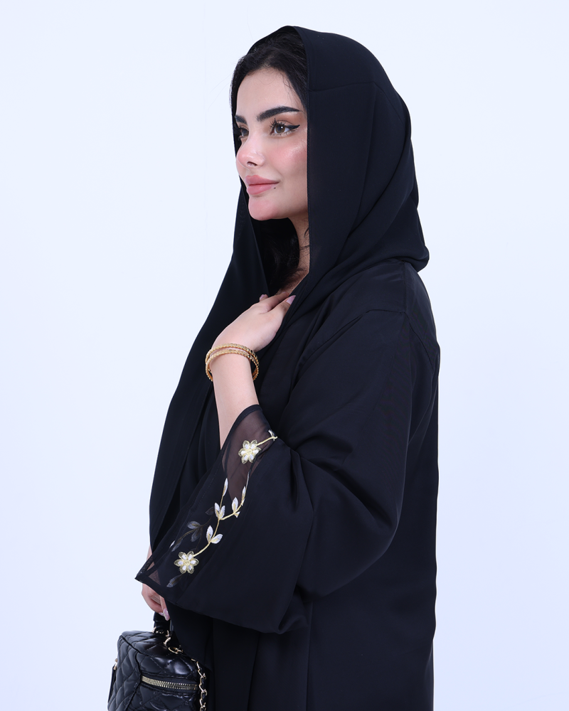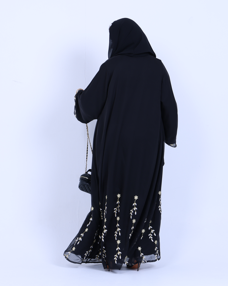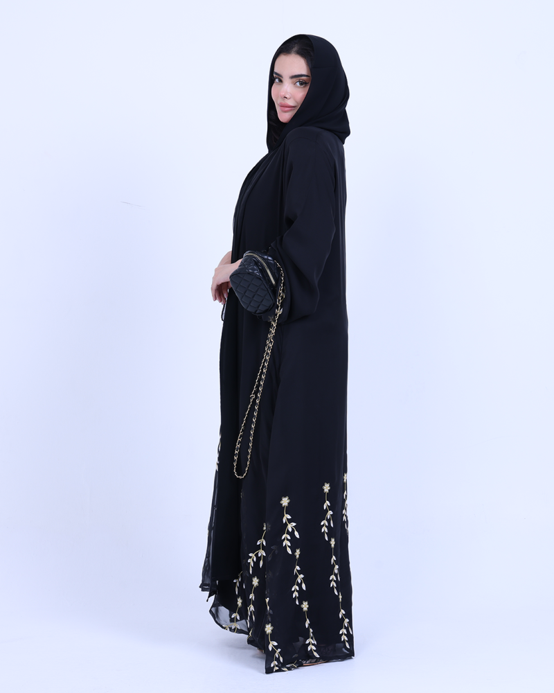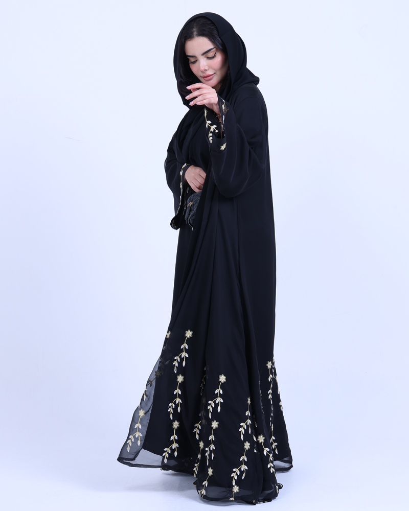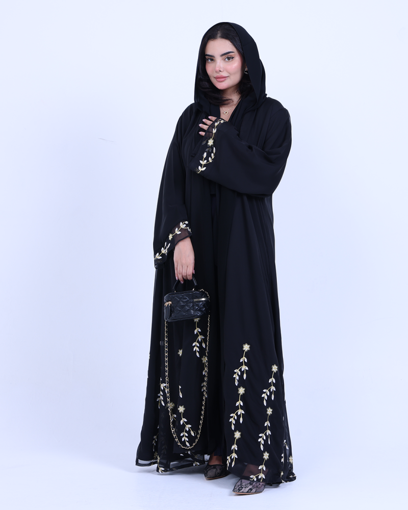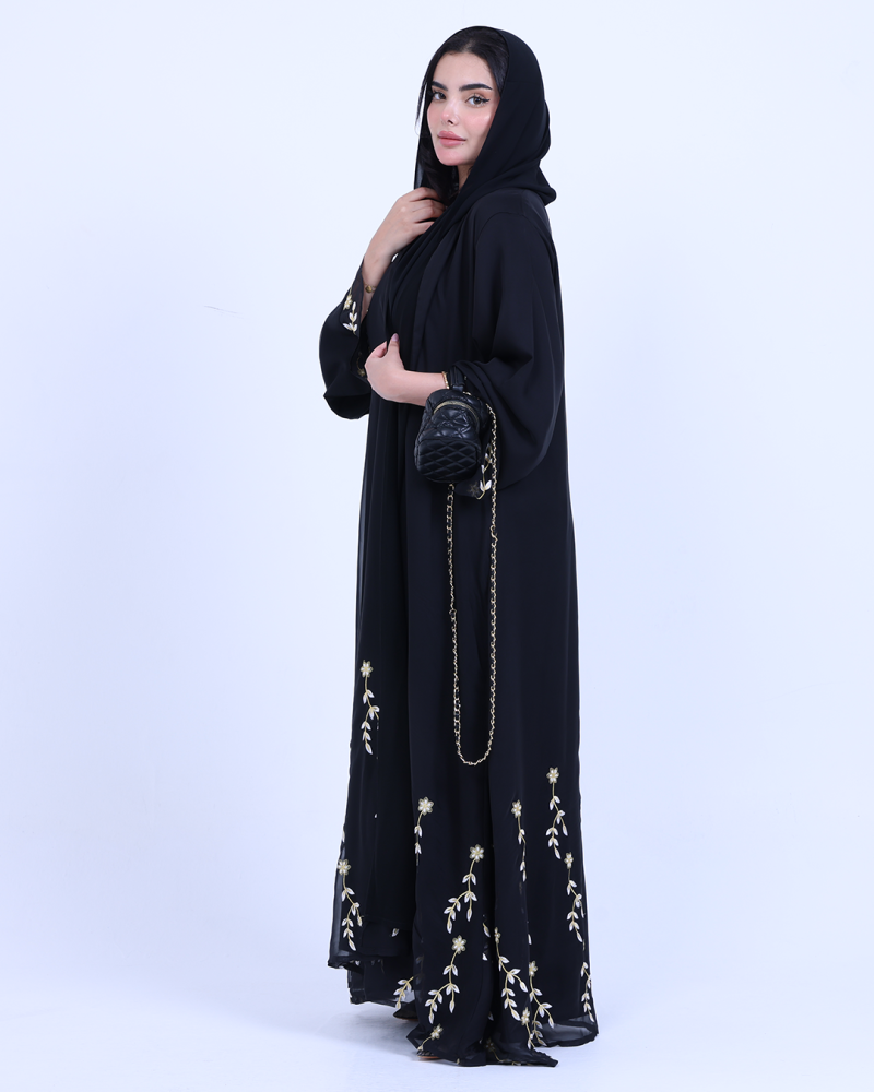 عباية ملكية التصميم تنطق فخامة، مصنوعة من طبقتين: شيفون ناعم مطرّز بخيوط ذهبية فاخرة تنسدل برقي على الأطراف، مع بطانة من كريب كوري أنيق يمنحك تغطية مثالية وراحة في اللبس. تطريز الأزهار الذهبية يزين أسفل العباية وأطراف الأكمام ليمنحك حضورًا أنثويًا ساحرًا في كل حركة. قصة نصف كلوش تضيف انسيابية راقية دون مبالغة، وتأتي العباية بطرحة سادة لتكمل الأناقة ببساطة ناعمة.