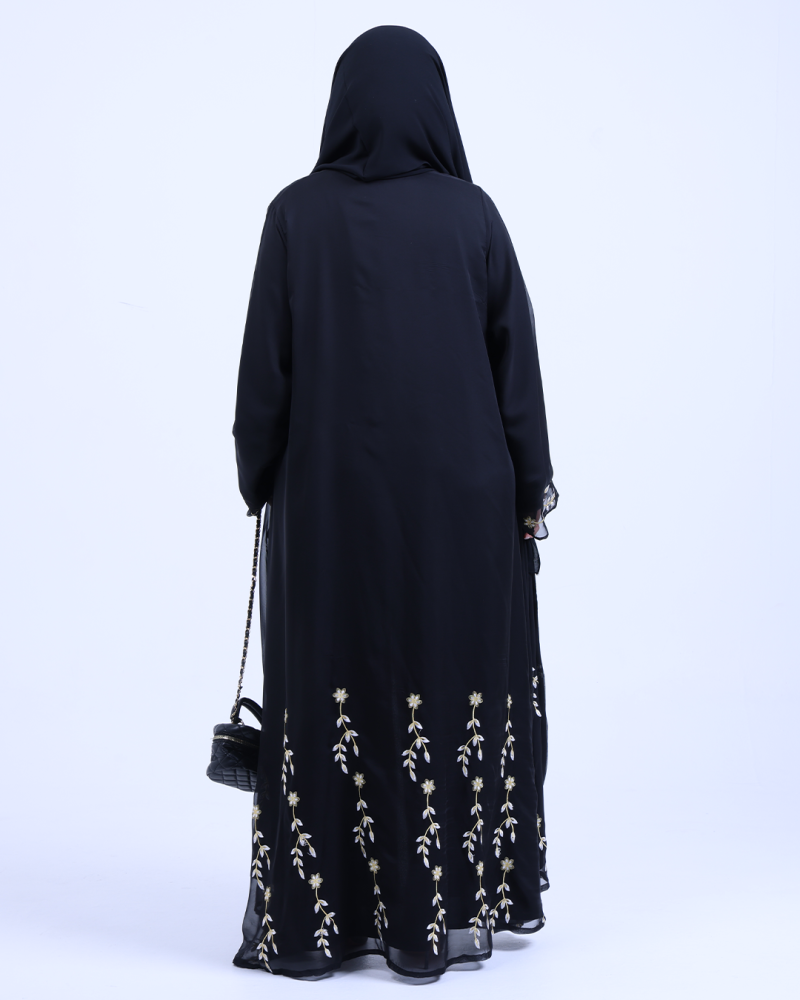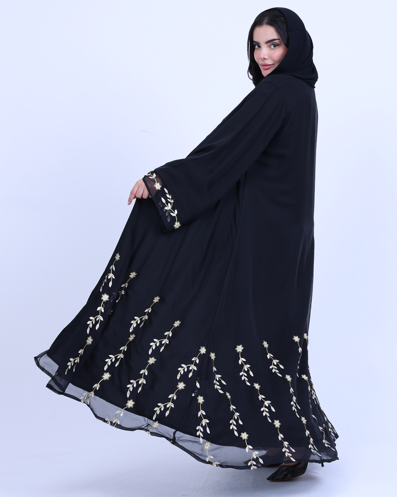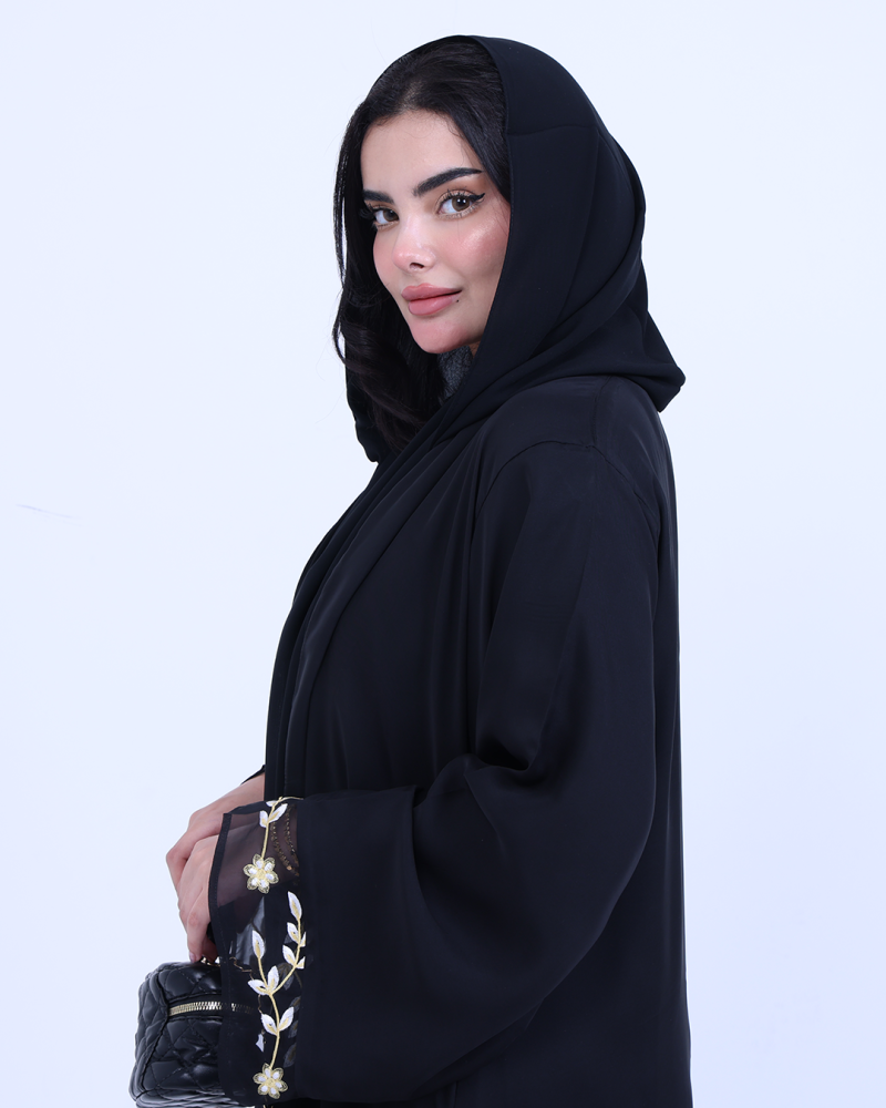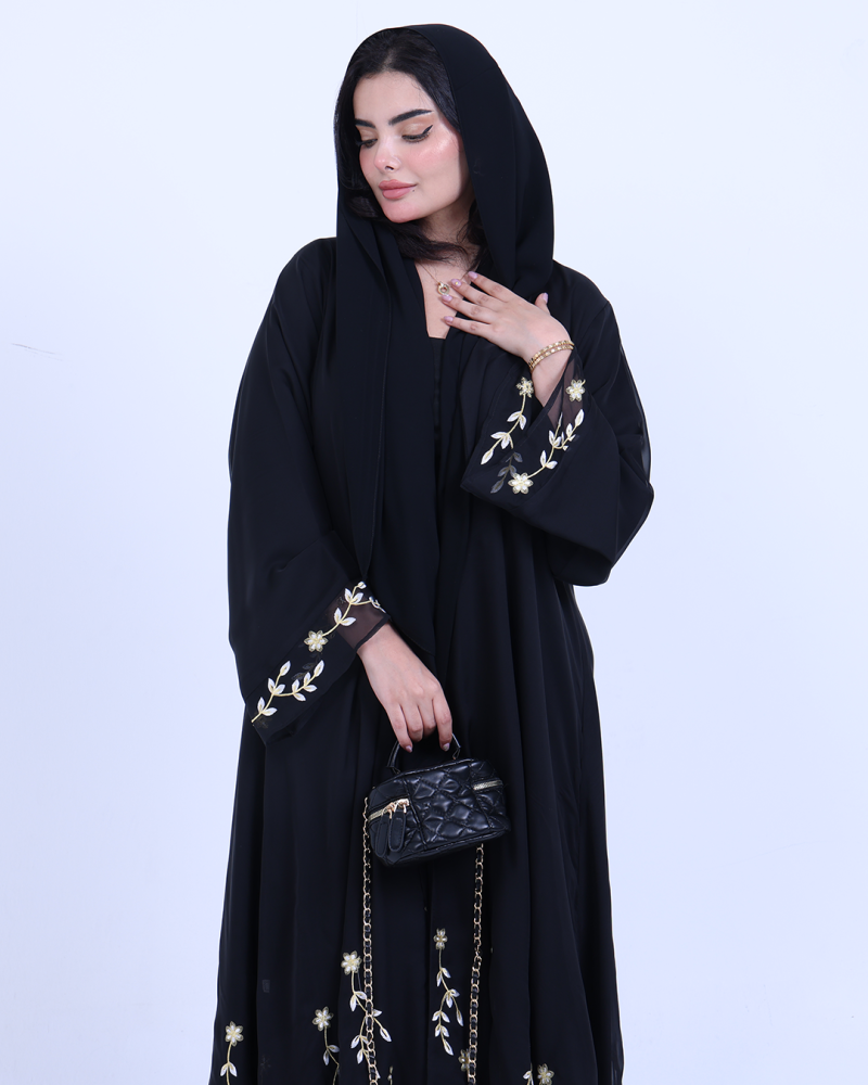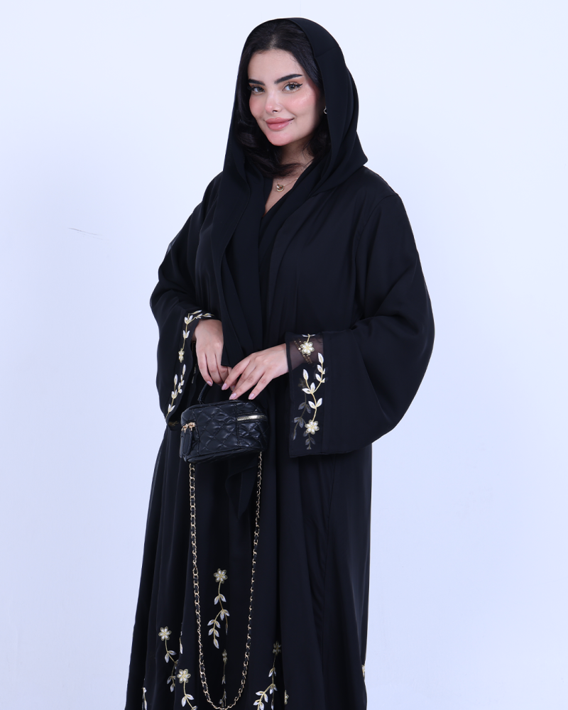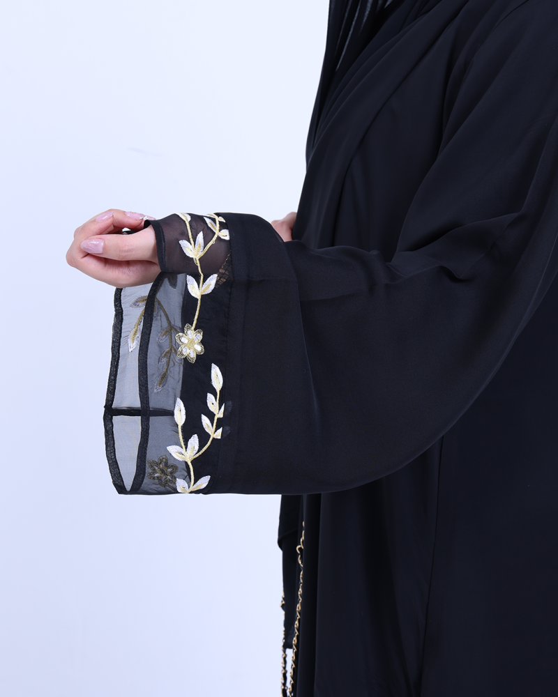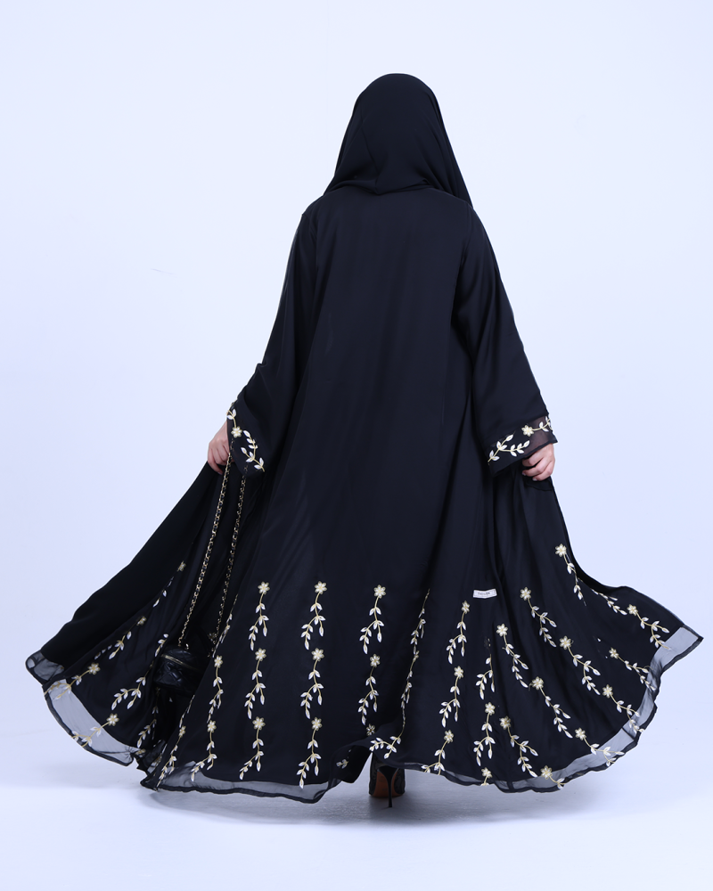 عباية ملكية التصميم تنطق فخامة، مصنوعة من طبقتين: شيفون ناعم مطرّز بخيوط ذهبية فاخرة تنسدل برقي على الأطراف، مع بطانة من كريب كوري أنيق يمنحك تغطية مثالية وراحة في اللبس. تطريز الأزهار الذهبية يزين أسفل العباية وأطراف الأكمام ليمنحك حضورًا أنثويًا ساحرًا في كل حركة. قصة نصف كلوش تضيف انسيابية راقية دون مبالغة، وتأتي العباية بطرحة سادة لتكمل الأناقة ببساطة ناعمة.